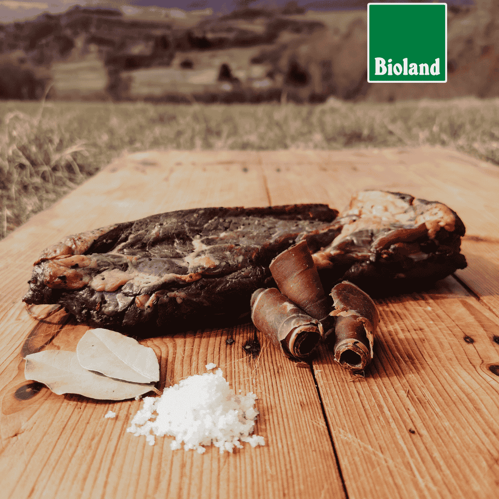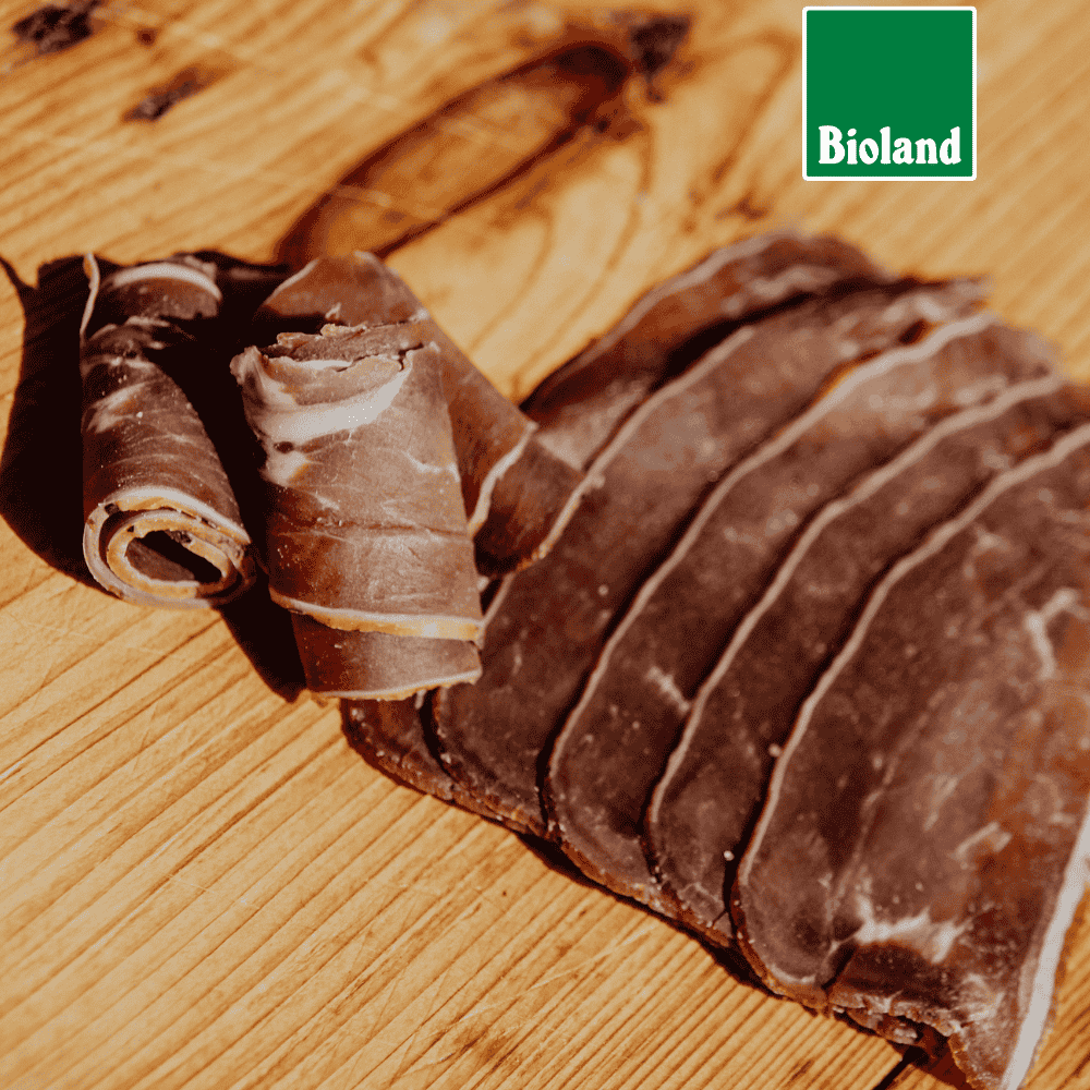 Unseren Bio-Rinderschinken stellen wir aus dem Fleisch unserer Bioland-Rinder her. Dezent gewürzt kommt der typische Geschmack gut zur Geltung. Unser Schinken reift über einen Zeitraum von etwa 10 Wochen und wird mit Buchenrauch geräuchert. Dadurch bekommt er sein leckeres Aroma und eine leicht rauchige Note. Bei Dir kommt er aufgeschnitten und vakuumverpackt an. Damit er sein ganzes Aroma entfalten kann, nimmst Du ihn am besten eine halbe Stunde vor dem Verzehr aus dem Kühlschrank und der Verpackung.