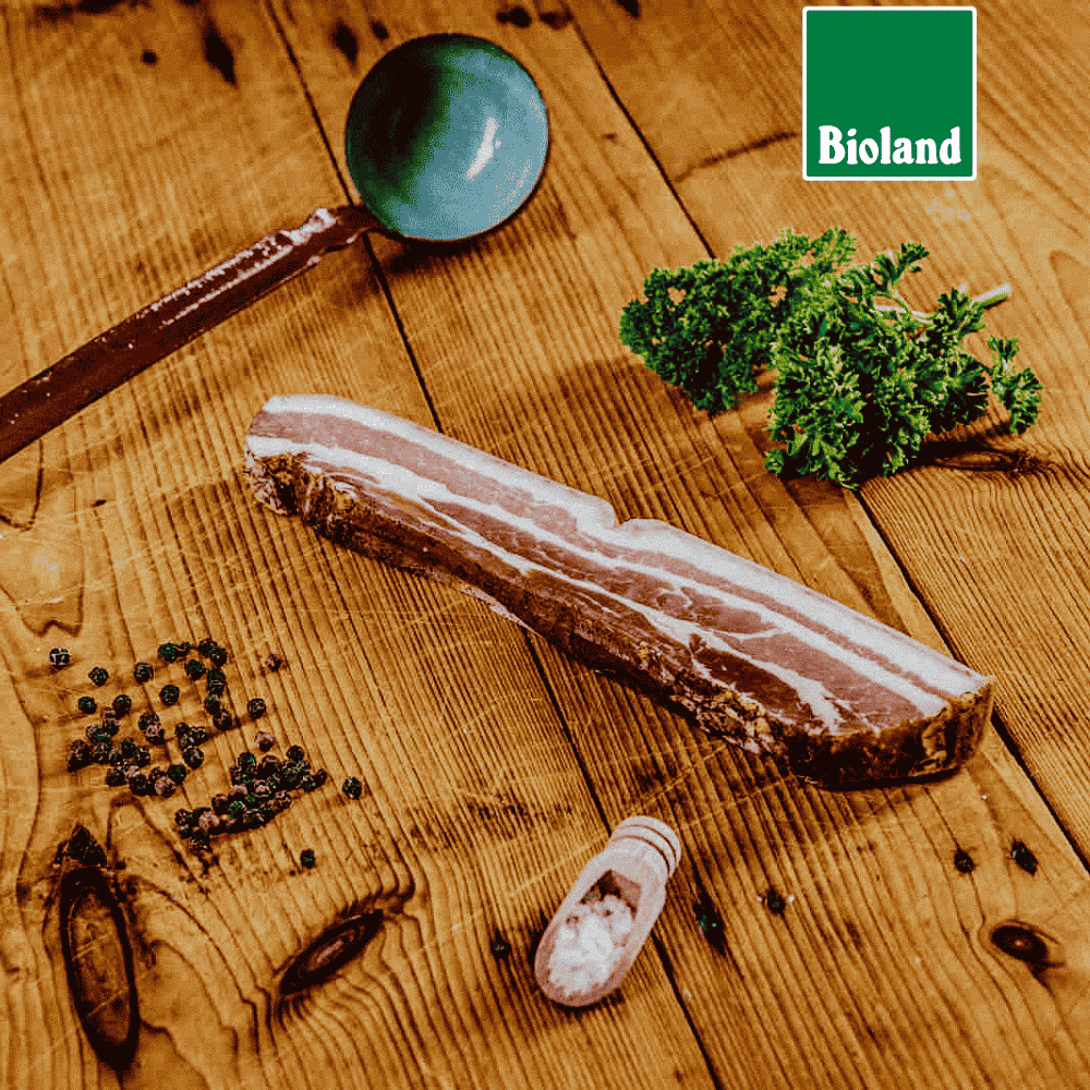 Unseren Bio-Speck stellen wir aus dem Bauchfleisch unserer Bioland-Schweine her. Gewürzt und im Buchenrauch geräuchert, reift er etwa 8 Wochen, wobei er sein leckeres Aroma erhält. Bei dir kommt er am Stück und vakuumverpackt an. Da wir den Schinken von Hand zuschneiden, können sich leichte Gewichtsdifferenzen ergeben. Damit er sein ganzes Aroma entfalten kann, nimmst Du ihn am besten eine halbe Stunde vor dem Verzehr aus dem Kühlschrank und der Verpackung. Er schmeckt wunderbar als Brotbelag, oder in Suppen und Eintöpfen.